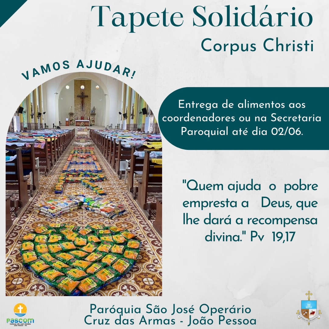 A paróquia São José Operário realiza nesta quinta-feira (3) Dia de Corpus Chirsti, o segundo ano do tapete solidário com alimentos para atender os necessitados da Paróquia. Diante dessa ação estamos motivando todos os grupos, movimentos, Pastorais e serviços para doação de alimentos para as famílias carentes. Cada grupo, movimento, Pastoral e serviços farão a contabilidade dos alimentos. "Contamos com a participação de todos. Quem tem fome tem pressa". Padre Heriberto.